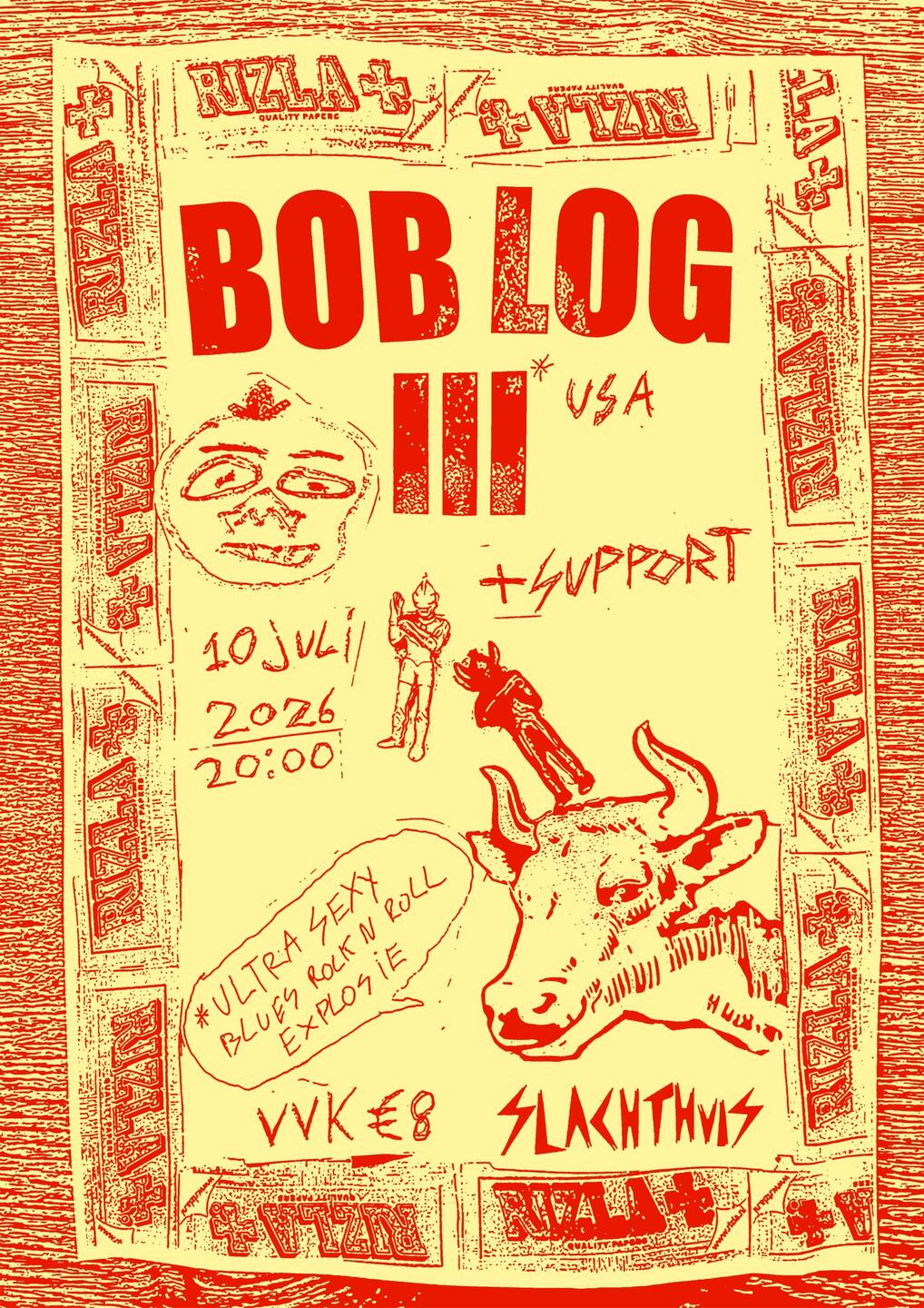 “Pak een gitaar, zet het volume omhoog en je hebt plezier.” Begin jaren 90 richtte hij samen met Thermos Malling de ongelooflijke band Doo Rag op, die de hele blues-‘punk’ of zelfs Tekkno-scene van die tijd heeft vormgegeven. De band splitste zich op en Bob Log (geboren Robert Reynolds III) ging solo verder als One Man Band, waarmee hij over de hele wereld toerde: Noord-Amerika, Europa, Japan, Australië, Mexico en IJsland.