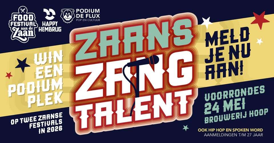 Podium DE FLUX, Zangstudio Tarah en het Foodfestival aan de Zaan slaan dit jaar de handen ineen om jong, lokaal talent in de spotlight te zetten door middel van een talentenjacht, waarbij deelnemers kans maken op die felbegeerde podiumplek tijdens Foodfestival aan de Zaan én Happy Hembrug!